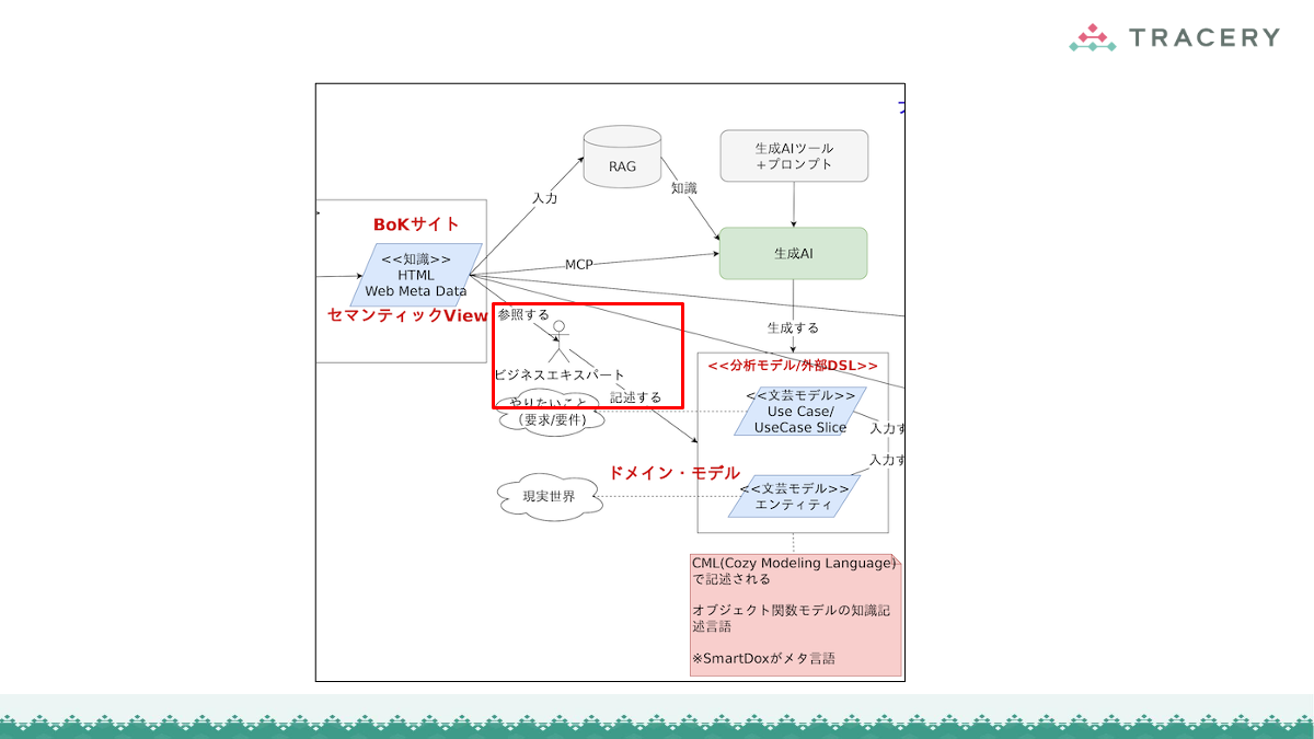 浅海:今まで話に出てきた知識、コンセプトモデル、分析モデルを、ビジネスエキスパート、開発者、そして AI が同じ立場で参照・更新できる共通のモデルとして扱う、というイメージです。